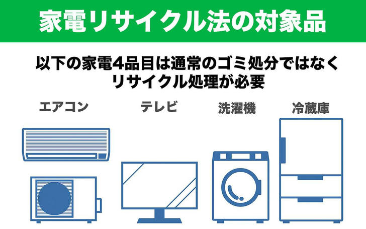 家電リサイクル法は、家庭や事務所から排出される特定の家電製品をリサイクルし、資源の有効活用と廃棄物の削減を目的とした法律です。対象は「家電4品目」と呼ばれる以下の特定家庭用機器のみです。